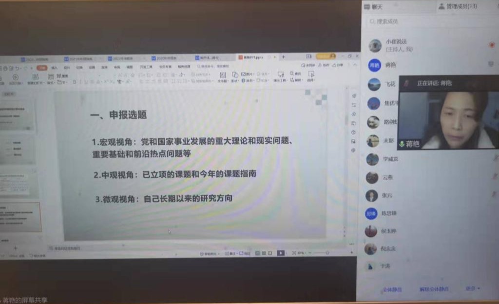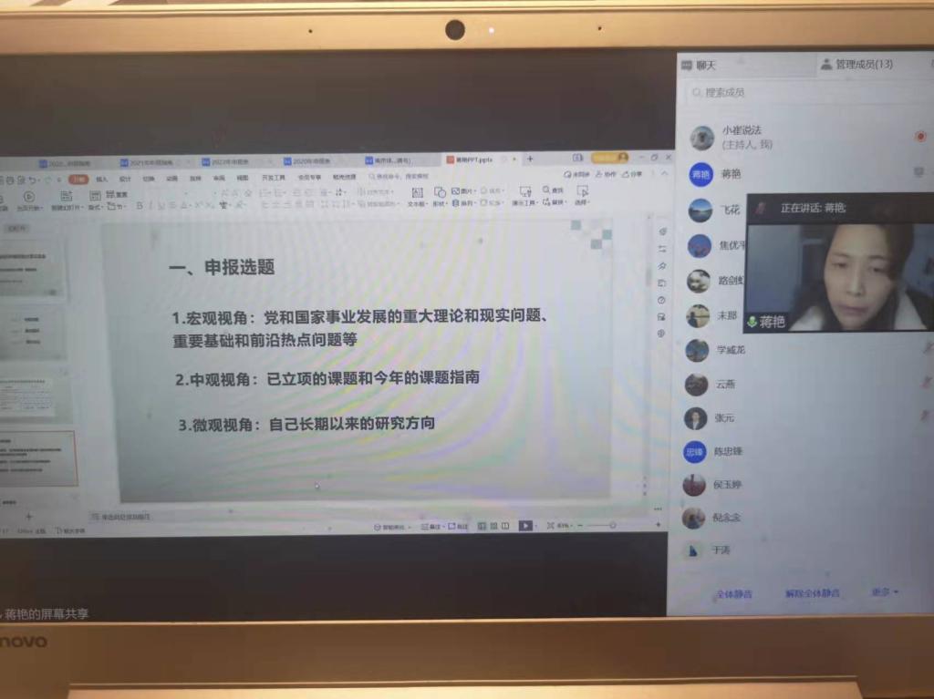 受疫情影响,此次国家社科基金申报辅导通过“线上”进行。蒋艳教授围绕如何撰写国家社科基金申报书,从选题方向确定、题目凝练、学术史梳理、研究内容阐述、研究创新点确定、研究方法运用等方面结合自己的申报经历深入浅出地进行了分享。她强调,不打无准备之仗,国家社科基金申报要提早谋划确定选题,要重视学术积累,更要保持饱满的热情,注重细节,以敢拼、敢闯的韧劲全身心投入其中。