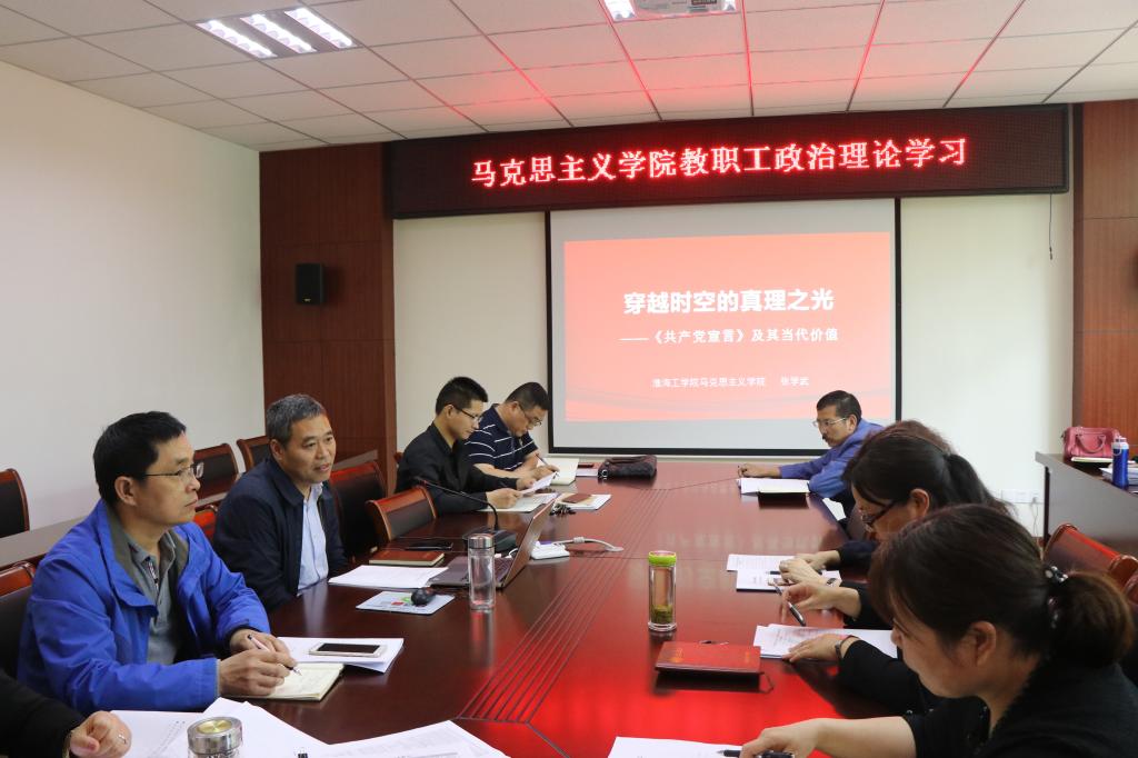 会上,大家首先一同学习了习近平总书记在纪念马克思诞辰200周年大会上的讲话。然后,张学武以“穿越时空的真理之光”为题,为大家作了一场专题报告。他沿着《共产党宣言》到当代中国马克思主义的历史脉搏,从真理之火不熄、实践之力铿锵、思想之光闪耀三个方面,阐述了马克思主义在当代中国的传承与发展。会上,老师们也就学习总书记的重要讲话精神谈了各自的体会。