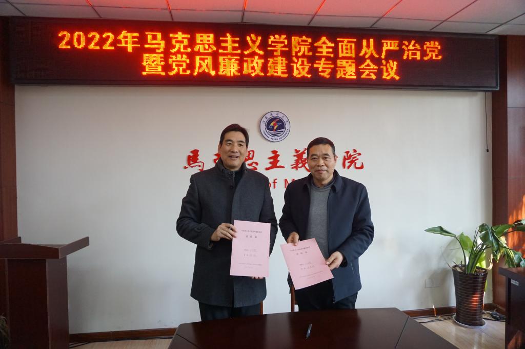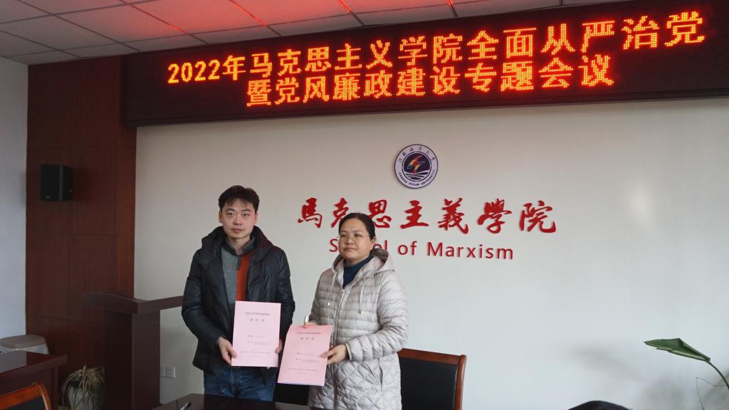 最后,张学武代表公司党总支与教工党支部书记、党政办公室主任签订了党风廉政建设责任书,与全体参会人员签订了意识形态工作责任书;沈春梅代表院行政与教学办主任、教研室主任分别签订了党风廉政建设责任书。