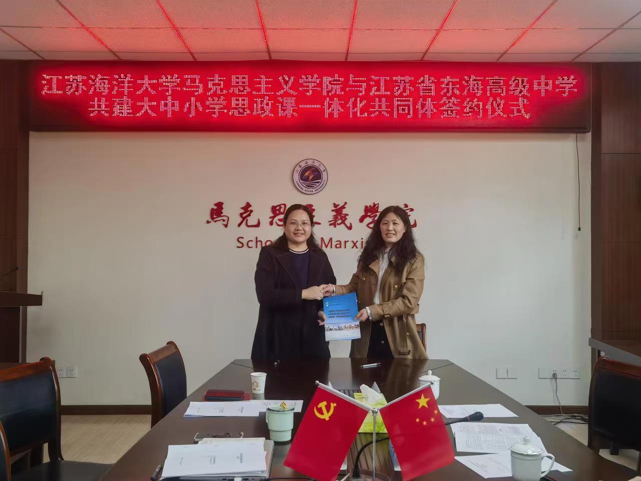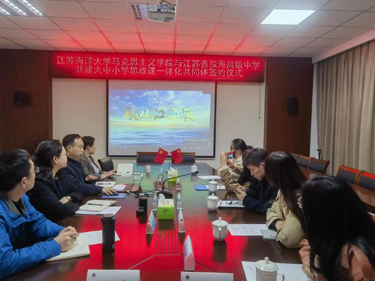 3月31日下午,公司与江苏省东海高级中学共建大中小学思政课一体化共同体签约仪式在公司会议室举行。公司党总支书记王波、经理沈春梅、各教研室主任,东海高级中学副董事长解学梅一行5人出席签约仪式。签约仪式由王波主持。