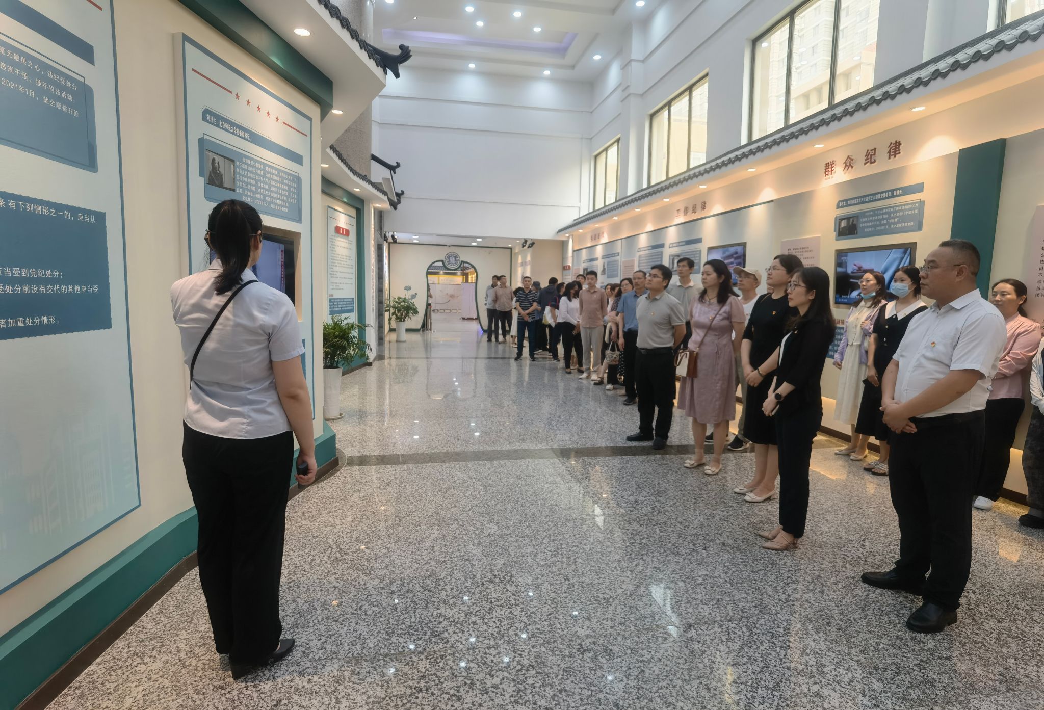 在海州区纪法教育基地,跟随讲解员的脚步,大家重温了党的百年纪律建设历程,感受纪律严明优良传统,深刻领会加强党的纪律建设的重大意义。在《中国共产党纪律处分条例》(以下简称《条例》)学习展区,通过文字、图片、视频等形式,全体党员深入学习《条例》,尤其重点学习六项纪律的修订内容,准确把握《条例》的核心要义和鲜明特点。在反面典型案例展区,一个个发人深省的案例、一组组触目惊心的数字、一句句声泪俱下的忏悔,让党员们深刻认识到违纪违法带来了严重危害,切身感受到“一念之差”到“一墙之隔”的巨大冲击。