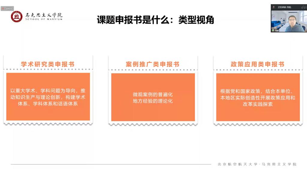 刘佳博士从课题申报书的类型、课题申报书的设计、课题申报书的艺术性等三个方面入手,深入浅出地分享了撰写课题申报书的经验。他指出,课题申报书的撰写要有强烈的目的性,要有自己的观点,要聚焦论证性要素、过程性要素、能力性要素等做好课题内容设计。他特别分享了自己先确定论述内容,后组织文献综述的方法,令大家颇受启发。