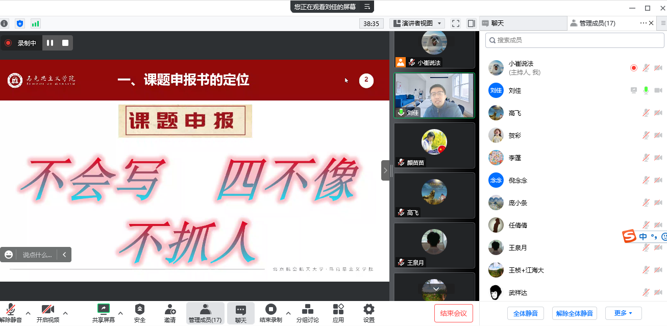 12月16日下午,公司邀请北京航空航天大学助理教授刘佳博士做客“攀登者”学术沙龙。刘佳博士以“课题申报的几点体会”为题,分享了自己在课题申报上的经验。本次沙龙通过腾讯会议进行,由副经理崔家新主持,公司全体博士教师参加了活动。