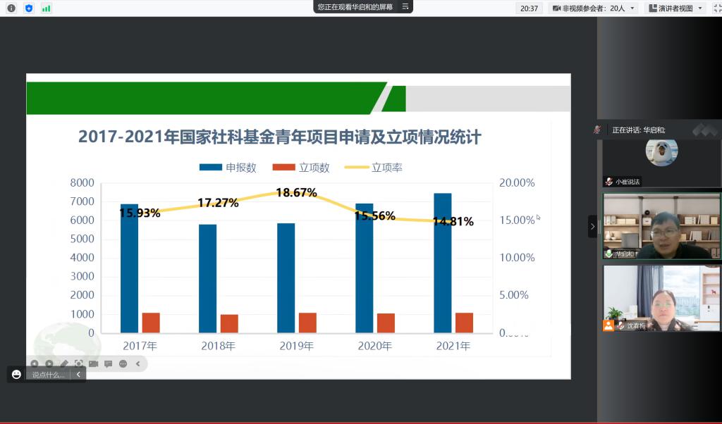 华启和教授从课题申报“精心选题”“潜心梳理”“尽心论证”等三方面入手,结合自身在撰写国家社科基金的心得体会作经验分享。他认为,选题既要固守自己的研究领域,又要合理跟进前沿问题和时代课题,在此基础上推敲出简洁新颖的题目;在文献梳理的过程中,要遵循全面、准确、精炼、客观的原则,突出学术价值和时代价值,表明核心观点和核心思想。他同时从研究内容、创新之处、预期成果、研究基础以及参考文献等方面对课题论证的过程予以全面细致的讲解。
