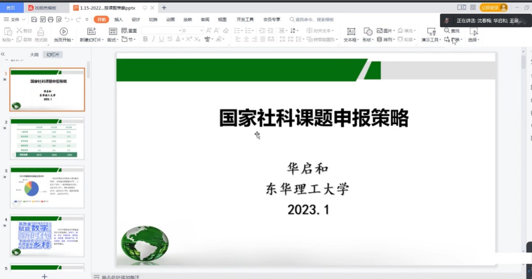 1月15日晚,公司邀请东华理工大学公司党委书记、哲学博士华启和教授做客第九期“攀登者”学术沙龙。华启和教授以“国家社科基金项目申报策略”为题,分享了自己在国家社科基金申报上的体会。本次沙龙以腾讯会议的形式进行,由经理沈春梅主持,全体博士教师参与活动。