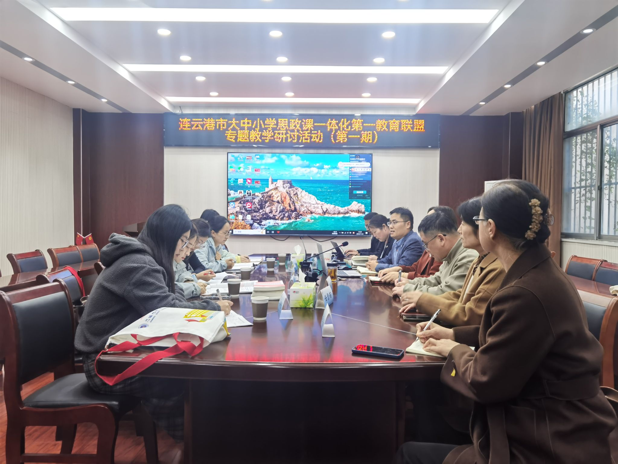 为更好推动大中小学思政课一体化建设,增进对各学段知识的相互了解,研讨教学重点和教学难点,11月6日,第一期连云港市大中小学思政课一体化建设第一教育联盟专题教学研讨活动在公司会议室举行。经理沈春梅、各教研室教师代表、连云港市新海高级中学思政课教师代表参加了活动,活动由副经理崔家新主持。