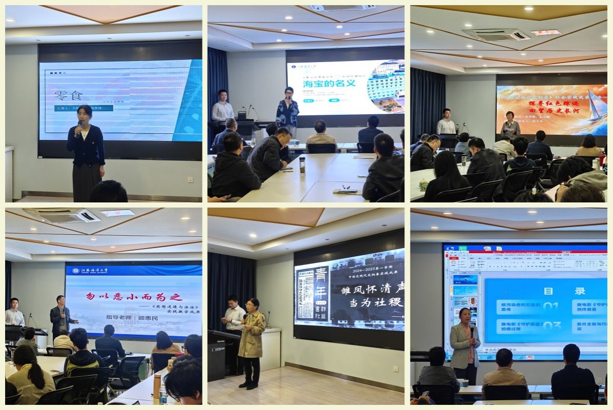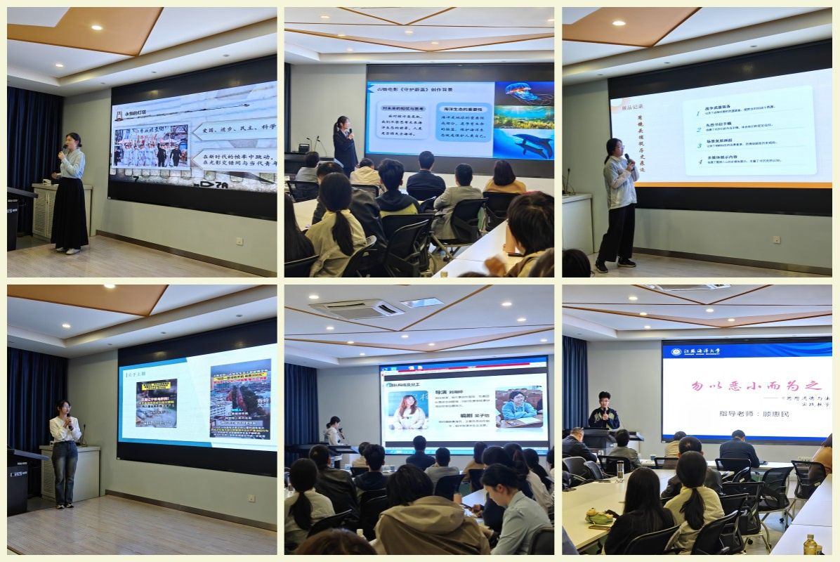 经过前期遴选,共有6件作品参与展示评比。本次展示评比采用“双视角解读”模式,由指导教师结合思政课实践教学主题揭示成果的理论和实践意义,员工团队则分享制作过程、作品构思和心得体会,形成“理论指导——实践转化”的立体对话。6件作品分别围绕《毛泽东思想和中国特色社会主义理论体系概论》《中国近现代史纲要》《思想道德与法治》》等课程展开,或是再现历史场景,营造历史与现实的时空对话,或是以核污染危机为切口,警示生态环境治理刻不容缓,或是以小见大,揭示人的贪欲,将法治精神融入青春叙事,或是在红色革命场馆中追寻红色踪迹,回望历史长河。
